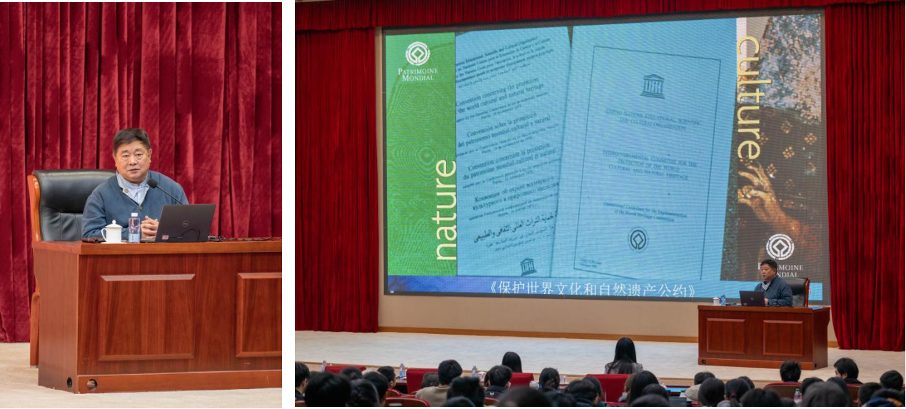 接下来,在吴晨院长的隆重介绍与全场热烈掌声中,单霁翔院长开始了引人入胜的演讲。他的讲座深入浅出,以亲历的生动故事,围绕“文化的力量,让文化遗产资源活起来”娓娓道来,分享文化遗产保护的心路历程,阐释活化文化遗产、丰富大众精神生活、增强文化自信的经验感悟。单院长还讲述了故宫从“管理文物”到“服务观众”、从“封闭保守”到“开放创新”的转型历程,通过分享环境整治、扩大开放、文物修复、文创开发等具体案例,深刻地阐释了如何将古老宫殿变为活力博物馆。他反复强调,让文化遗产“活起来”,核心是让其历史、艺术与科学价值以可亲可感的方式融入现代生活,从而滋养大众心灵、坚定文化自信。单院长的讲述妙趣横生又发人深省,期间多次引发全场掌声雷动,反响极为热烈。